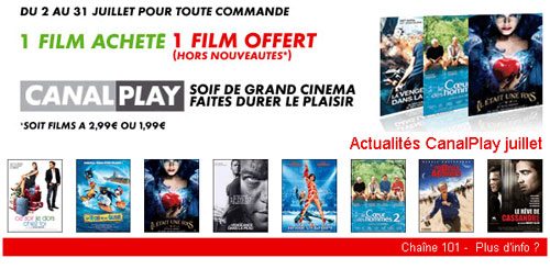 Du 2 au 31 juillet Canalplay via Freebox vous en donne plus. En effet, selon « la lettre des abonnés Free Haut Débit » de ce mois, pour tout film acheté, un second vous est offert. Seul petit bémol, le film gratuit ne peut être une nouveauté, il faudra donc choisir parmi les films à 1,99€ ou 2,99€. Une bonne nouvelle pour commencer l’été tout en cinéma.