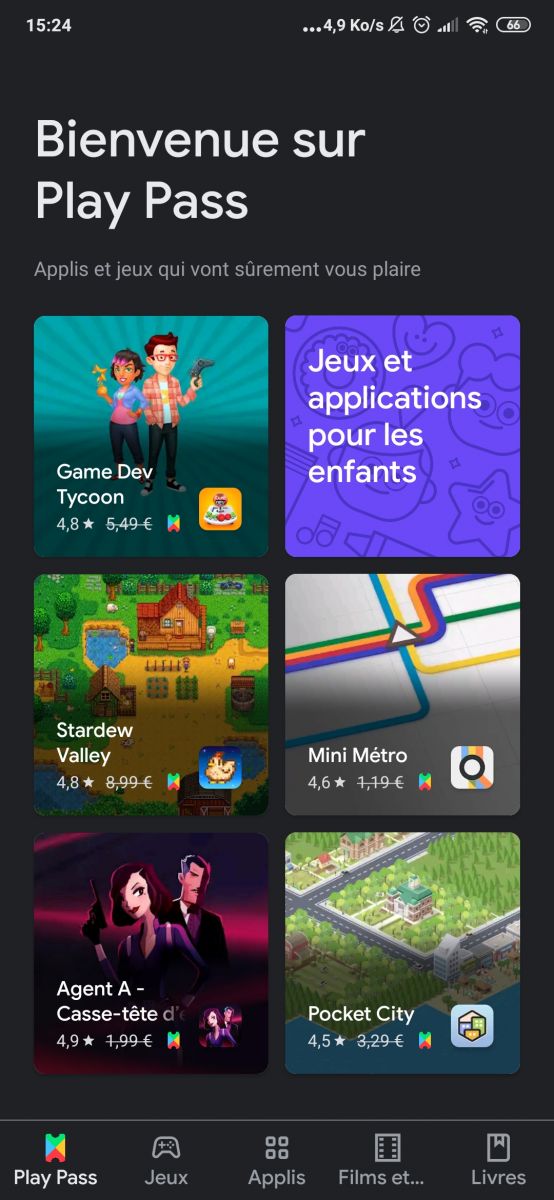 C’est la réponse de Google au service Apple Arcade de la marque à la pomme, le Google Play Pass permet d’accéder à un catalogue d’application en s’acquittant de la somme de 4,99 € par mois.