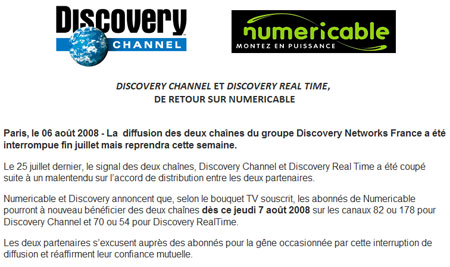 Nous vous relations il y a quelques jours les problèmes entre Numéricâble et Discovery. Ce dernier avait en effet coupé le flux de ses deux chaines, Discovery Channel et Real Time, du bouquet TV de Numéricâble.