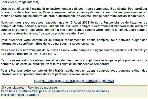 Une attaque Phishing cible actuellement les clients Orange. La médiocrité de l’attaque ainsi que les dizaines de fautes d’orthographe révèlent rapidement le caractère frauduleux de ce courrier émanant de "service@Orange.fr".Le mail invite les clients Orange à visiter un site (http://id.orange.fr..) conçu par le pirate pour améliorer la sécurité. Derrière cette "façade" se cache un site hébergé chez Wistee.fr. Le site pirate n’est pas piégé par un trojan. L’intention du pirate est de récupérer les informations sensibles des comptes (id, mots de passe...).
