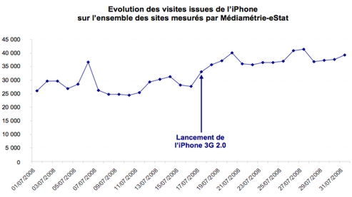 «L’effet 3G» a eu son effet. Selon une étude Médiamétrie publiée mercredi, les visites sur internet à partir du nouveau combiné téléphonique d’Apple ont crû de 33% depuis son lancement en France. Sur l’ensemble des 33 groupes et 62 sites surveillés par Médiamétrie-eStat, on comptait 28.125 visites en provenance de l’IPhone en moyenne par jour du 1er au 16 juillet. Depuis le 17 juillet, date de sa sortie en France, et jusqu’au 31, ce nombre est passé à 37.423 visites en moyenne par jour, soit 33% de plus qu’un jour moyen de la première partie du mois, note l’étude. Visiblement, la connectivité 3G du nouvel iPhone offre une meilleure expérience du web que celle qui était proposée avec l’ancienne version, dont la connectivité se limitait au réseau EDGE, deux fois moins rapide.