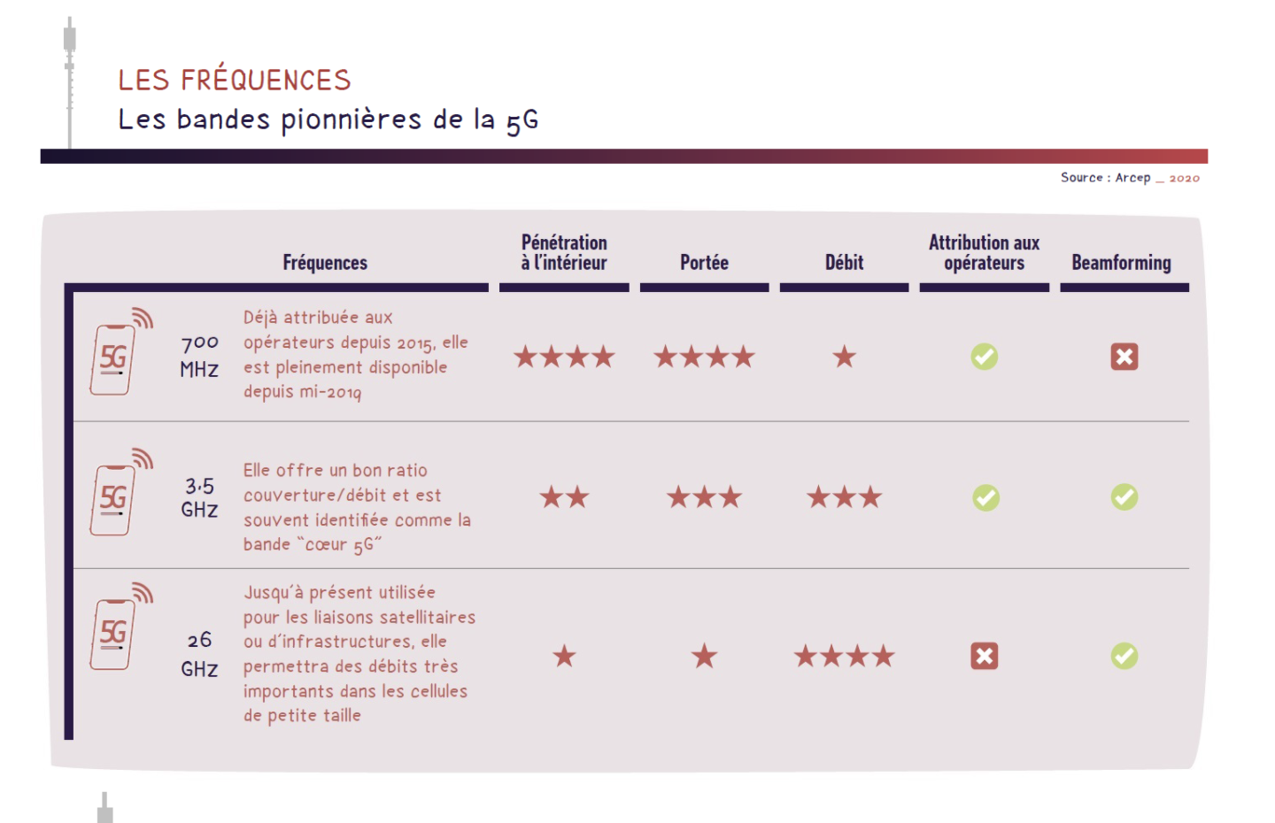 L’observatoire publié aujourd’hui met ainsi en lumière les stratégies différentes des opérateurs concernant les bandes de fréquences utilisées : si tous les opérateurs ont chacun déployé des sites en bande 3,5 GHz, ils ont également utilisé des fréquences plus basses en complément de la bande 3,5 GHz. Bouygues Telecom, Orange et SFR se sont appuyés sur la bande 2,1 GHz, et Free Mobile se distingue par l’usage de la bande 700 MHz. Les bandes basses apportent une meilleure couverture surfacique et à l’intérieur des bâtiments, mais des débits non comparables à ceux fournis par les bandes hautes comme la 3,5 GHz. Ces différentes bandes de fréquences présentent chacune des atouts distincts, résumés dans les tableaux ci-après.