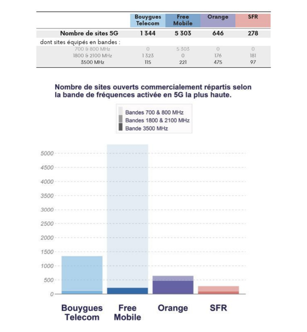 Sur la seule bande 3,5 GHz, Orange prend les devants avec 475 sites activés, devant Free Mobile et ses 221 sites en service. Derrière, suit Bouygues Telecom (115 supports) et SFR (97 sites). Un même site peut être équipé de plusieurs bandes de fréquences pour fournir le service 5G. Ainsi, le nombre de sites total peut être inférieur à la somme des sites répartis selon les bandes de fréquences.