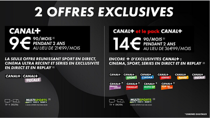 La première offre est proposée à 9,90€/mois durant deux ans, puis 21,99€/mois. Elle intègre les chaînes Canal+ et Canal+ Décalé