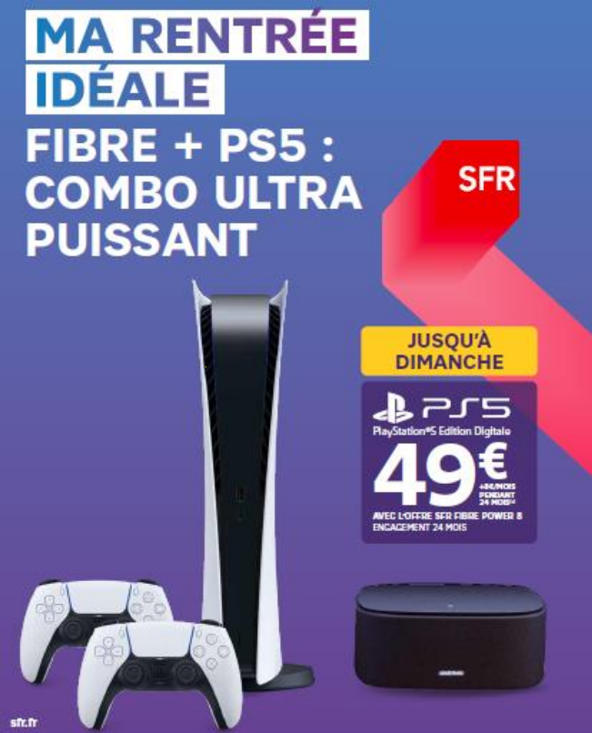 SFR annonce le lancement d’une offre inédite puisque pour la première fois, un forfait box est couplé avec une console de jeux, à savoir la PlayStation 5. Associée à l’offre SFR Fibre Power, la PS5 Edition Digitale, accompagnée de deux manettes DualSense, soit un lot d’une valeur de 469,98€ TTC (prix conseillé), est accessible au tarif de 49€ à l’achat + 8€/mois pendant 24 mois grâce à la facilité de paiement. Les clients de l’offre Box + PS5 bénéficient également de la livraison sécurisée gratuite en main propre, ainsi que de l’option Multi TV et du disque dur numérique d’une capacité de 300 heures.