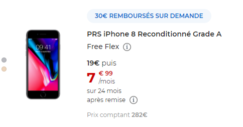 Le deuxième smartphone concerné est l’iPhone 8 reconditionné Grade A qui bénéficie d’une ODR de 30 euros. Avec Free Flex, sur une durée de 24 mois pour ce mobile, le premier paiement sera de 19€ (au lieu de 49€ sans l’ODR), puis 24 loyers suivants de 7.99€/mois. A l’issue des 24 mois, vous avez le choix entre restituer votre mobile ou l’acquérir en versant le montant de l’option d’achat de 41€.
