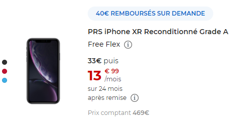 Le second smartphone concerné est l’iPhone XR reconditionné Grade A qui bénéficie d’une ODR de 40 euros. Avec Free Flex, sur une durée de 24 mois pour ce mobile, le premier paiement sera de 33€ (au lieu de 73€ sans l’ODR), puis 24 loyers suivants de 13.99€/mois. A l’issue des 24 mois, vous avez le choix entre restituer votre mobile ou l’acquérir en versant le montant de l’option d’achat de 60€.