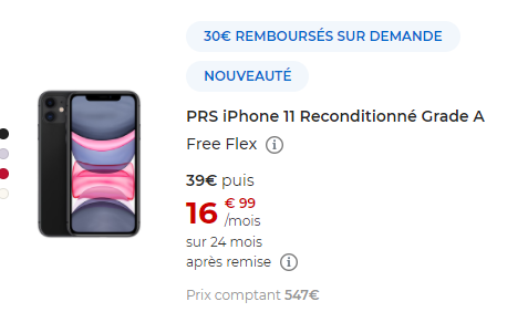 Le dernier smartphone concerné est l’iPhone 11 reconditionné Grade A qui bénéficie d’une ODR de 30 euros. Avec Free Flex, sur une durée de 24 mois pour ce mobile, le premier paiement sera de 39€ (au lieu de 69€ sans l’ODR), puis 24 loyers suivants de 16.99€/mois. A l’issue des 24 mois, vous avez le choix entre restituer votre mobile ou l’acquérir en versant le montant de l’option d’achat de 70€.