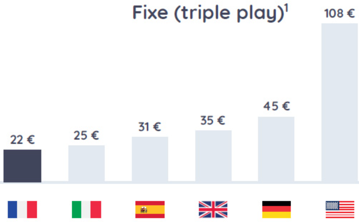 Concernant le fixe, la France est le pays où la vie est moins chère, avec en moyenne des offres triple play qui coûte 22€ par mois. Sont prise en compte dan cette étude la téléphonie illimitée au moins sur les fixes, internet via ADSL ou fibre, télévision incluse. Les tarifs prix en compte sont ceux "hors promotion"