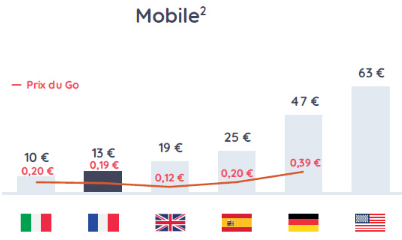Sur le mobile, la France se fait dépasser par l’Italie, un pays où Free a également fait baisser les prix. Ainsi en France, le prix moyen d’un forfait est de 13€/mois contre 10€/mois en Italie, avec un prix moyen du Go de 0,19€. Pour réaliser son comparatif Arthur D. Little a pris en compte les forfait avec appels illimités, SMS/MMS illimités, avec au moins 50Go de data. Les offres étudiées sont celles sans engagements et sans téléphone inclus.