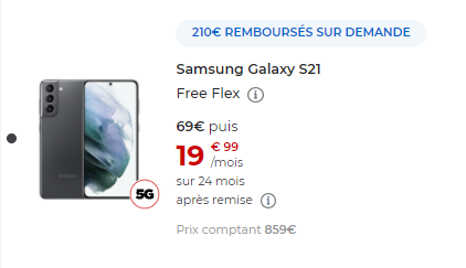 Free vient de lancer une remise importante un des Samsung les plus haut de gamme de sa boutique en ligne. Cela concerne le Samsung Galaxy S21 qui bénéfice d’une offre de remboursement de baisse de 210€. Cette promotion est valable uniquement avec la formule Free Flex. Attention cependant, l’offre de remboursement n’est disponible qu’une quinzaine de jours, jusqu’au 16 février. Vous avez ensuite jusqu’au 18 mars pour demander votre (remboursement.