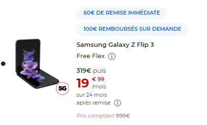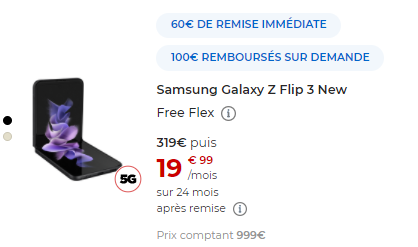 Le troisième smartphone est le Galaxy Z Flip 3 New, dont le prix passe de 1059€ à 999€, soit 60€ de remise. A cela s’ajoute une offre de remboursement de 100€, ce qui porte le prix final de ce smartphone à 899€.