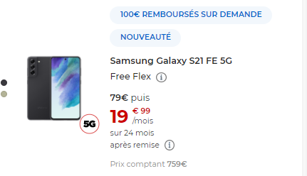 Le premier smartphone concerné est Galaxy S21 FE 5G qui bénéficie d’une ODR de 100 euros. Avec Free Flex, sur une durée de 24 mois pour ce mobile, le premier paiement sera de 79€ (au lieu de 179€ sans ODR), puis 24 loyers suivants de 19.99€/mois. A l’issue des 24 mois, vous avez le choix entre restituer votre mobile ou l’acquérir en versant le montant de l’option d’achat de 100€. A défaut de choix, prorogation tacite du contrat pour des périodes successives d’un mois. Cette offre est valable très peu de temps, jusqu’au 9 février..