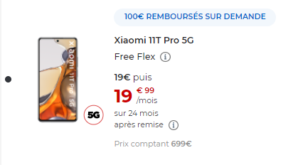 Le second smartphone concerné est le Xiaomi 11T Pro qui bénéficie d’une ODR de 100 euros. Avec Free Flex, sur une durée de 24 mois pour ce mobile, le premier paiement sera de 19€ (au lieu de 119€ sans ODR), puis 24 loyers suivants de 19.99€/mois. A l’issue des 24 mois, vous avez le choix entre restituer votre mobile ou l’acquérir en versant le montant de l’option d’achat de 100€. A défaut de choix, prorogation tacite du contrat pour des périodes successives d’un mois. Cette offre est valable jusqu’au 16 février.