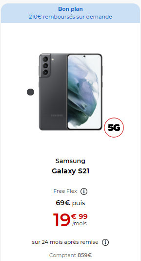 Free vient de lancer une remise importante un des Samsung les plus haut de gamme de sa boutique en ligne, qu’il avait déjà proposée en janvier, et qui est la plus importante concernant son offre Free Flex. Cela concerne le Samsung Galaxy S21 qui bénéfice d’une offre de remboursement de baisse de 210€. Cette promotion est valable uniquement avec la formule Free Flex. Attention cependant, l’offre de remboursement n’est disponible qu’une quinzaine de jours, jusqu’au 2 mars. Vous avez ensuite jusqu’au 1er avril pour demander votre (remboursement.
