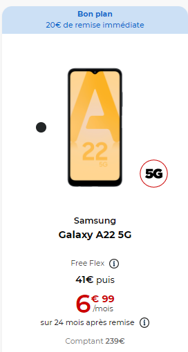 Le second smartphone concerné est le Galaxy A22 5G qui bénéficie d’une remise de 20€.