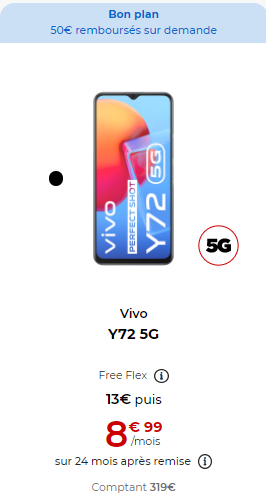 Le premier smartphone concerné est le VIvo Y72 5G qui bénéficie d’une ODR de 50 euros. Avec Free Flex, sur une durée de 24 mois pour ce mobile, le premier paiement sera de 63€ (13€ en déduisant l’ODR), puis 24 loyers suivants de 8.99€/mois. A l’issue des 24 mois, vous avez le choix entre restituer votre mobile ou l’acquérir en versant le montant de l’option d’achat de 40€. A défaut de choix, prorogation tacite du contrat pour des périodes successives d’un mois. Cette offre est valable jusqu’au 23 mars..