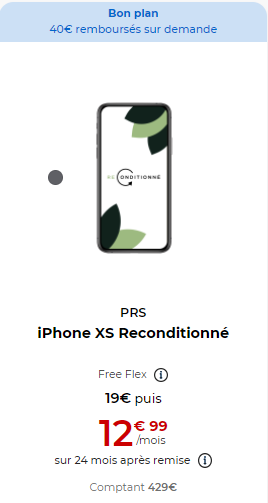 Le deuxième smartphone concerné est l’iPhone XS reconditionné qui bénéficie d’une ODR de 40 euros. Avec Free Flex, sur une durée de 24 mois pour ce mobile, le premier paiement sera de 59€ (19€ en déduisant l’ODR), puis 24 loyers suivants de 12.99€/mois. A l’issue des 24 mois, vous avez le choix entre restituer votre mobile ou l’acquérir en versant le montant de l’option d’achat de 58€. Cette offre est valable jusqu’au 23 mars.