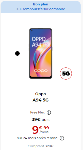 Le troisième smartphone concerné est l’Oppo A94 qui bénéficie d’une ODR de 10 euros. Avec Free Flex, sur une durée de 24 mois pour ce mobile, le premier paiement sera de 49€ (soit 39€ en déduisant l’ODR), puis 24 loyers suivants de 9.99€/mois. A l’issue des 24 mois, vous avez le choix entre restituer votre mobile ou l’acquérir en versant le montant de l’option d’achat de 40€. Cette offre est valable jusqu’au 6 avril..