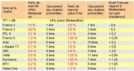 Médiacabsat, l’audience des chaînes du câble et du satellite, prenant en compte TF1 et M6, nous avons minoré les résultats des parts de marchés des chaînes TV de Freebox TV pour que la comparaison soit équivalente (un facteur de 66% à été appliqué, le complément représentant l’audience de TF1 et M6 chez les abonnés à une offre élargie).