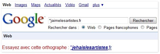 D’ailleurs, nous avons noté lors de nos recherches sur le terme "jaimelesartistes.fr", que même Google, le célèbre moteur de recherche, nous conseille littéralement d’essayer avec l’orthographe "jehaislesartistes.fr".