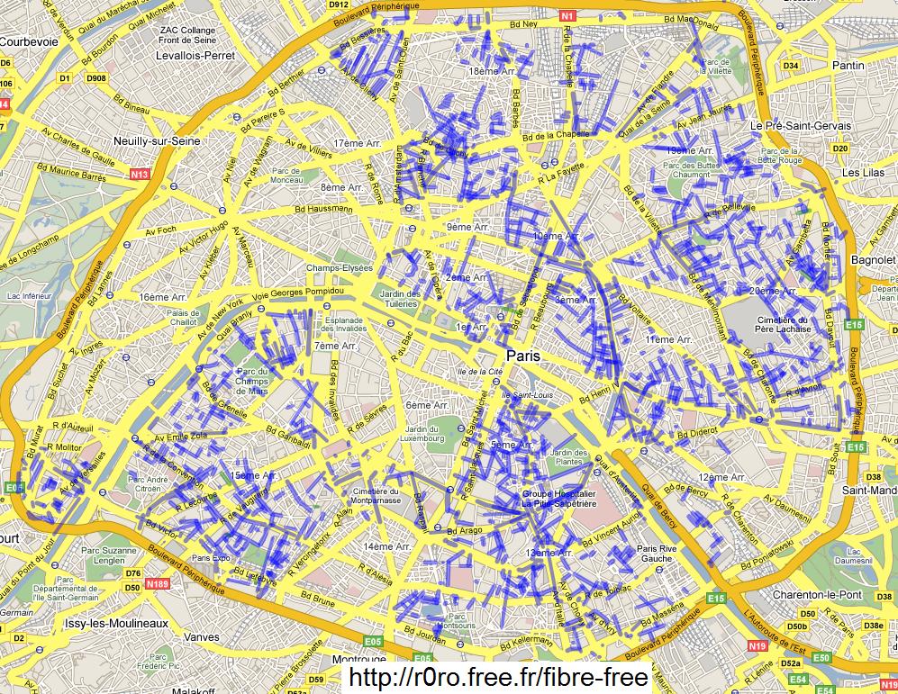 Romain, un Freenaute nous a envoyé une carte très intéressante concernant les rues couvertes ou en cours de déploiement à l’offre Fibre Optique de Free.