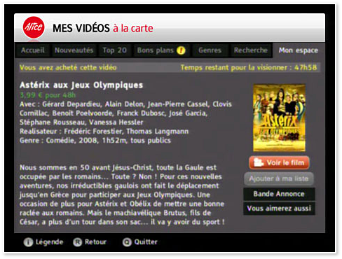 Alice (sous le contrôle d’Iliad-Free) se dote d’une nouvelle offre de VOD (Vidéo à la Demande) à la carte. Tous les abonnés à l’offre Alice TV peuvent accéder à plus de 4500 vidéos sur Internet, puis les regarder directement sur le téléviseur.Comment ça marche ? Et bien, c’est très simple, Un abonné Alice devra visiter un portail dédié sur Internet, ou figure par moins de 4500 programmes (films, séries TV, dessins-animés, concerts, documentaires, etc.). Il lui suffira d’acheter le programme de son choix, et de valider les CGV (Conditions Générales de Ventes). Après validation des CGV, la transaction est facturée et reportée sur la prochaine facture de l’abonné.
