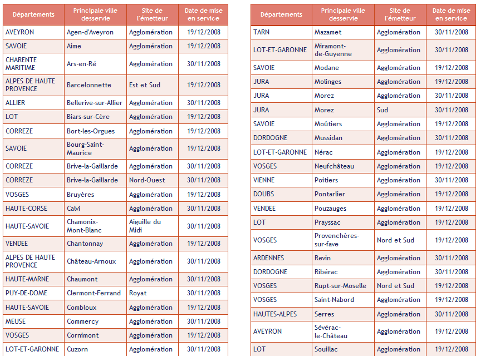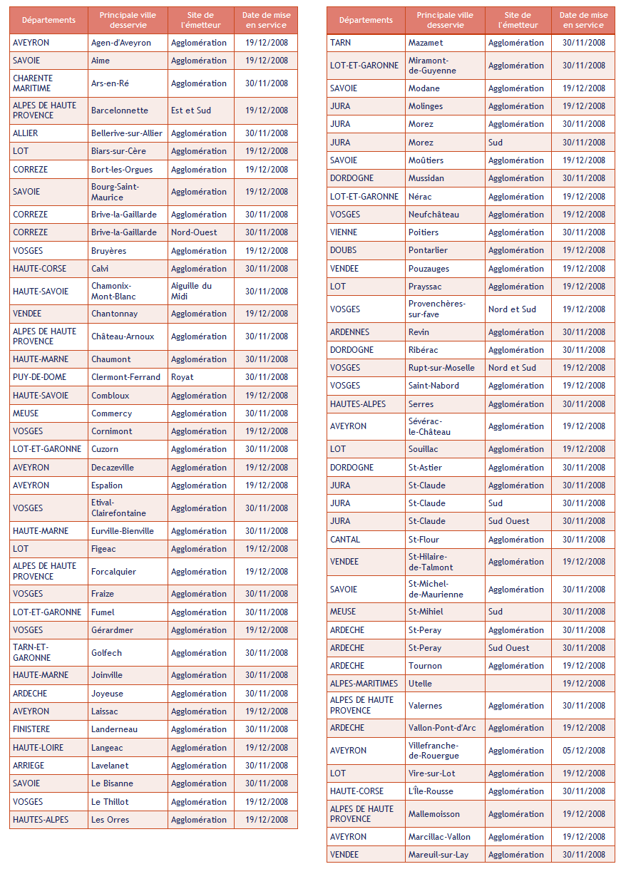 Le Conseil supérieur de l’audiovisuel, réuni en assemblée plénière le mardi 25 novembre 2008, a fixé les dates d’ouverture de 77 nouveaux émetteurs grâce auxquels la télévision numérique terrestre (TNT) sera mise en service entre le 30 novembre et le 19 décembre 2008.Ces 77 nouvelles zones complètent les 55 agglomérations déjà mises en service en 2008. Ainsi, à la fin de cette année, la télévision numérique terrestre desservira près de 53 millions d’habitants, près de 87% de la population métropolitaine.