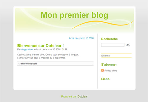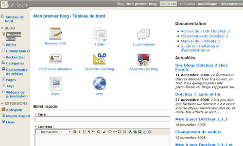 L’adresse du blog sera de la forme monblogue.blog.free.fr et l’administration de celui-ci se fera à l’adresse monblogue.blog.free.fr/admin/index.php. Comme ce service est basé sur Dotclear, vous bénéficiez ainsi des fonctions de ce dernier : création de catégories, publication de billets, gestion des commentaires. Vous pouvez également choisir le thème graphique de votre blog parmi les centaines que propose le catalogue.