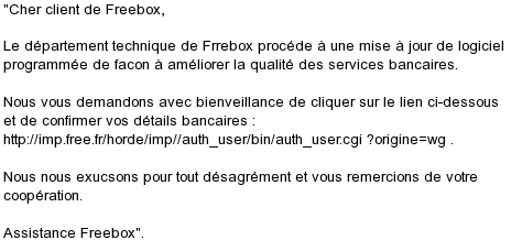 Une nouvelle attaque phishing est en cours contre Free et les Freenautes. A l’aide d’un email, le pirate tente d’attirer les abonnés sur une fausse page - identique à l’ancienne console de gestion des abonnés - dans le but de dérober les identifiants, les mots de passe, les numéros de carte bancaire...Contrairement à la première attaque de l’année, les pages frauduleuses sont toujours actives (attention site contrefait).