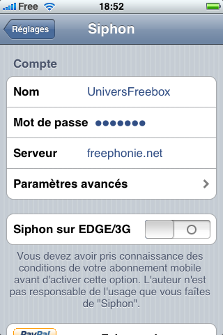 Configuration de Siphon (Nouvelle option "Siphon sur Edge/3G)