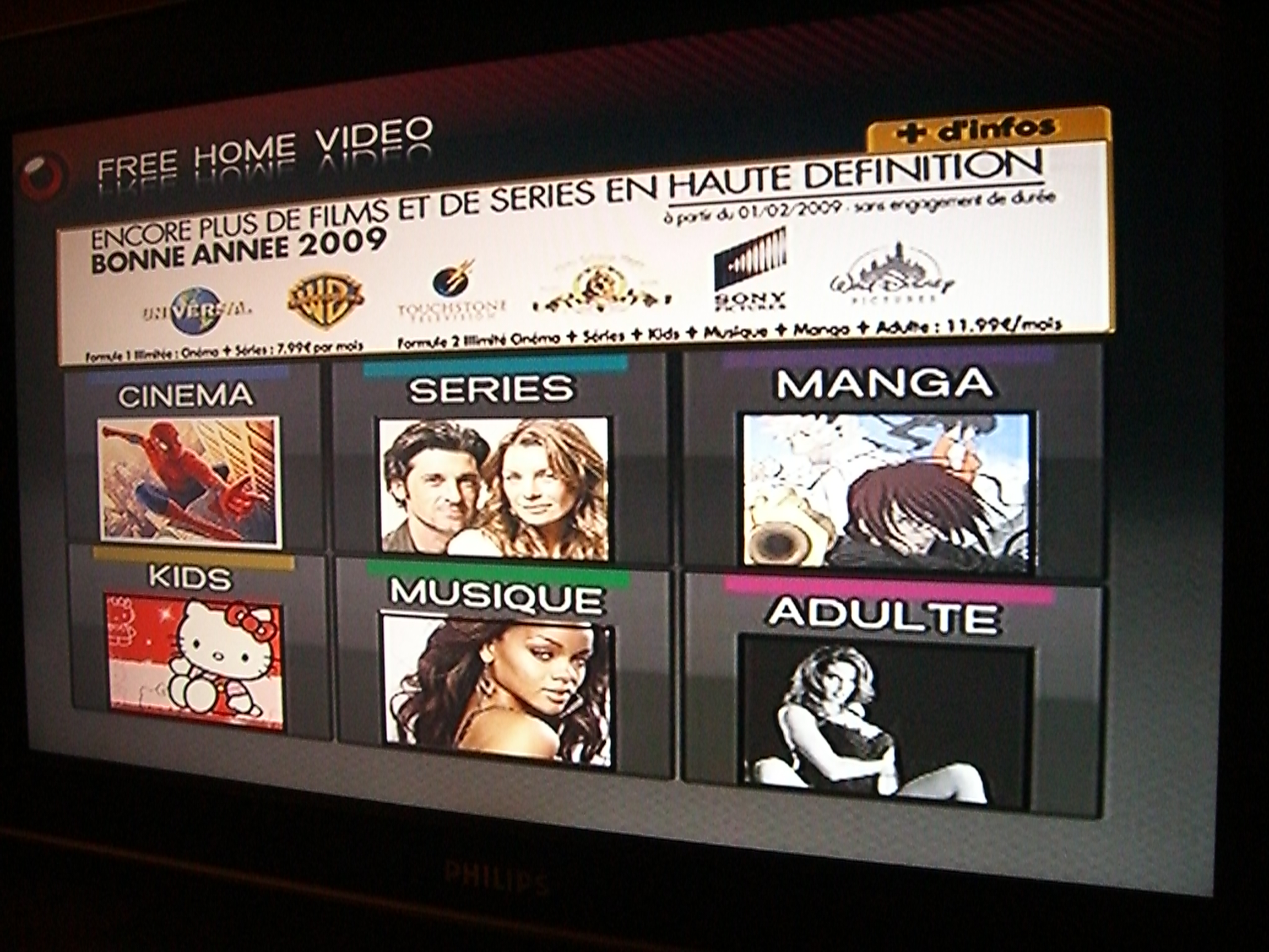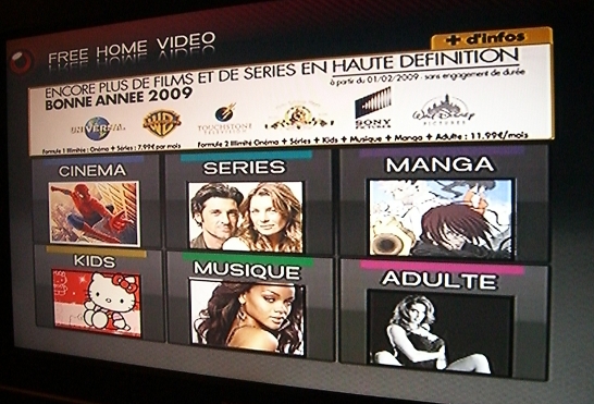 Un panneau publicitaire, diffusé sur le canal de Free Home Vidéo (canal 33) indique l’arrivée de "plus de films et de séries en Haute Définition". A partir du 1 février 2009, de nouvelles sélections de films et de séries seront disponibles avec Universal, Sony Pictures et MGM - en plus des catalogues déjà présents (Disney, Warner Bros, TouchStone). Le panneau stipule également l’augmentation des tarifs de FHV (voir image).