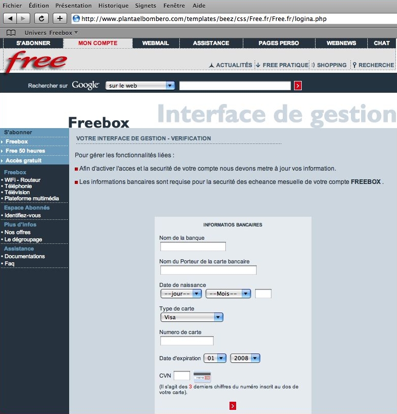 Une deuxième attaque phishing est en cours contre les Freenautes. Le second site frauduleux imite également l’ancienne console de gestion (toujours dans le but de dérober les informations confidentielles des abonnés). Les pages frauduleuses se trouvent à cette adresse (attention site frauduleux).