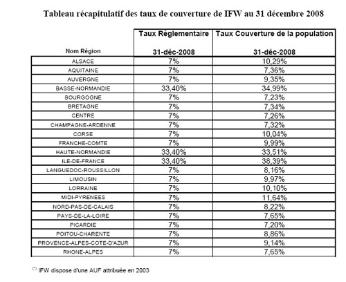C’est la bonne surprise de ce bilan, IFW respecte, et même dépasse, ses obligations de couverture sur l’ensemble des régions. Le taux de couverture de la population monte même jusqu’à 38,39% en Ile de France