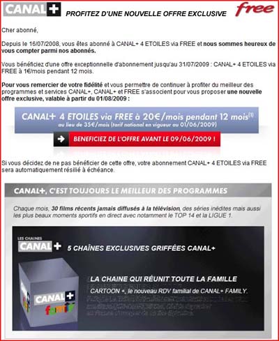 Les 12 mois arrivant à échéance, Canal+ tente de convertir ces freenautes en fidèles abonnés Canal+. C’est ainsi que les personnes concernées reçoivent actuellement un mail leur annonçant qu’elles peuvent continuer à bénéficier de Canal+ (et de ses déclinaisons) pour 20€ par mois au lieu de 35€ par mois.