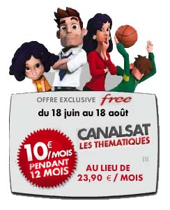 Canalsat vient de lancer une nouvelle offre à destination des freenautes. Le bouquet « Les thématiques » est proposé à 10€ par mois durant 12 mois, au lieu de 23,90€. Pour ce tarif, vous aurez accès aux 80 chaînes du bouquet de base. Cette offre est valable du 18 juin au 18 aout. A noter cependant que 50€ vous seront demandés pour les frais d’accès.
