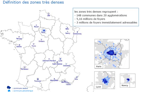 Ces zones concernent un peu plus de 5 millions de foyers et chaque opérateur devra installer une fibre supplémentaire pour chacun des ses concurrents qui lui en fera la demande. Ce sont donc ces zones qui seront prioritairement desservie par la fibre, même si il n’y a aucune garantie que toutes le seront. La région parisienne concentre le plus grand nombre de ces zones denses, mais une vingtaine d’autres agglomérations sont également concernées.
