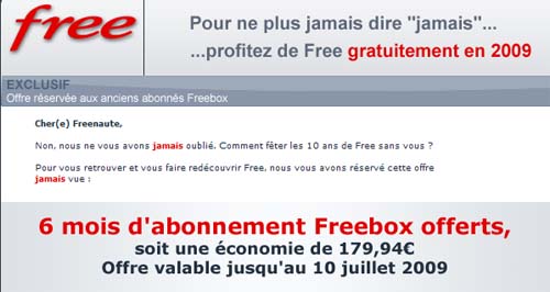 Free envoie actuellement un mail aux anciens freenautes qui ont résilié leur abonnement afin de leur faire une offre commerciale. Et la proposition est intéressante puisque ce ne sont pas 1, ni 2, ni 3 mais 6 mois d’abonnement offerts qui sont proposés ! Soit une économie de 179,94€.