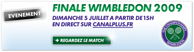 Dimanche 5 juillet à partir de 15h, Canal+ propose aux internautes de suivre gratuitement l’intégralité de la finale Wimbledon 2009, qui opposera Andy Roddick à Roger Federer. Un lecteur web dédié à cette occasion retransmettra le match, en direct depuis le site de Canalplus.fr.