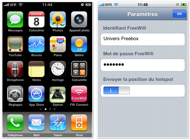 FreeWifi Connect est un application qui simplifie la connexion au réseau communautaire WiFi des Freenautes. En enregistrant l’identifiant et le mot de passe, FreeWiFi Connect automatise la connexion au hotspot FreeWiFi et permet de se connecter d’un simple click. L’application permet également d’envoyer (ou non) la position géographique du hotspot (afin d’établir une carte des hotspots FreeWiFi disponibles). La carte est réalisée en partenariat avec Freebox-wifi.fr. Elle sera bientôt disponible directement sur l’iPhone et sur iPhone.r0ro. L’application FreeWifi Connect est disponible gratuitement dans l’AppStore d’Apple.